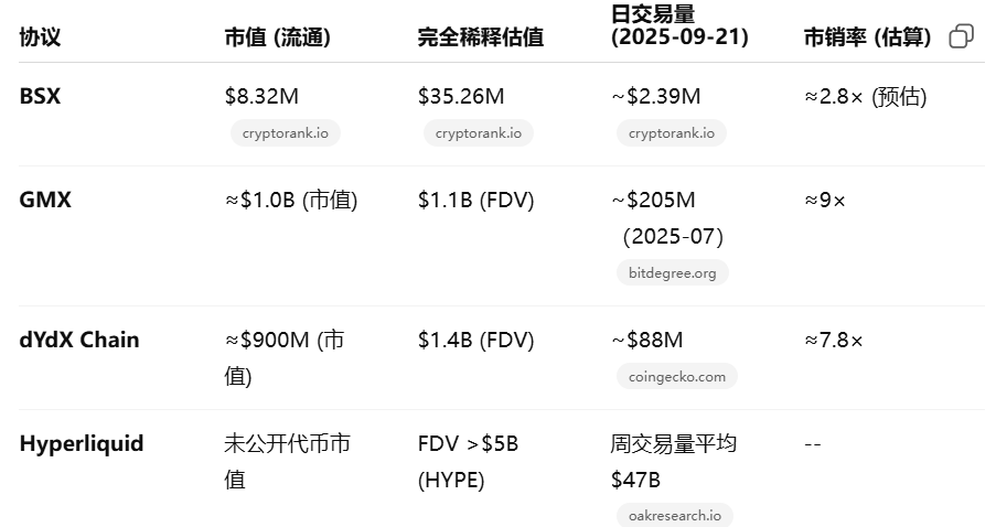 BSX 市值仅为 $8.32M,完全稀释估值约 $35.26M,远低于 GMX、dYdX 等头部协议(GMX 市值约 $1.0B,dYdX 市值约 $0.9B)。但估值不能单看市值,还需考虑收入、增长和风险。