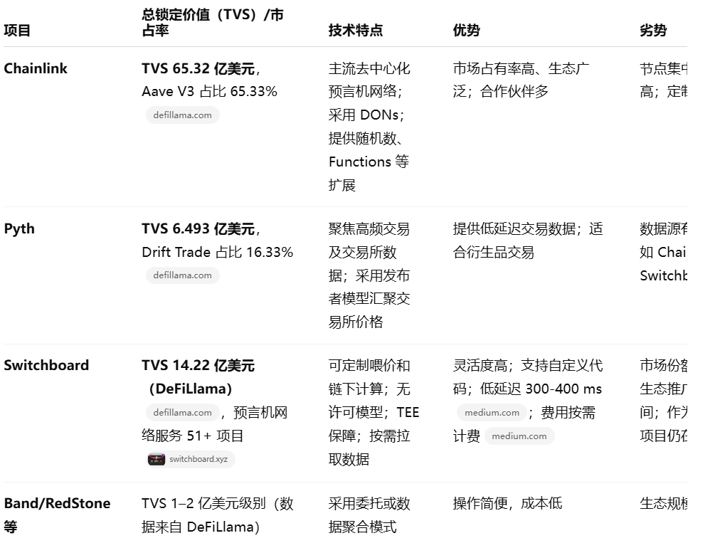 在预言机赛道,Chainlink 长期占据主导地位,但也面临 Pyth、Switchboard、Band、RedStone 等新兴挑战者。以下是主要竞品的对比: