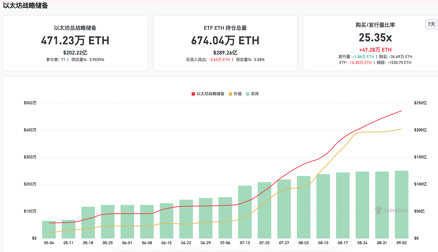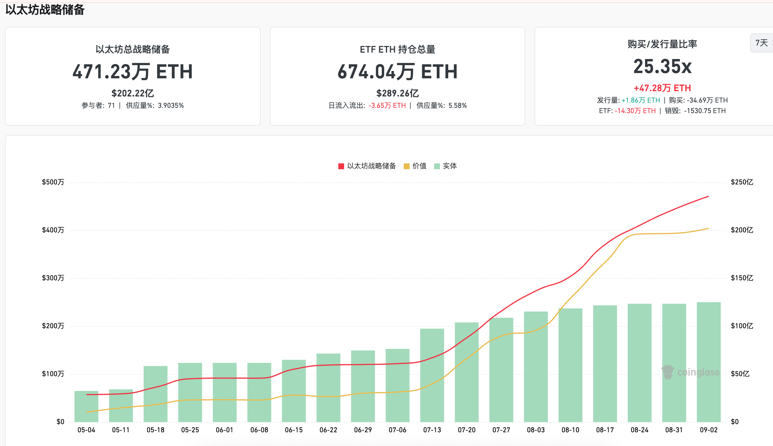 机构持有总量:约4,094,561 ETH(价值约176亿美元,占总供应量3.39%)