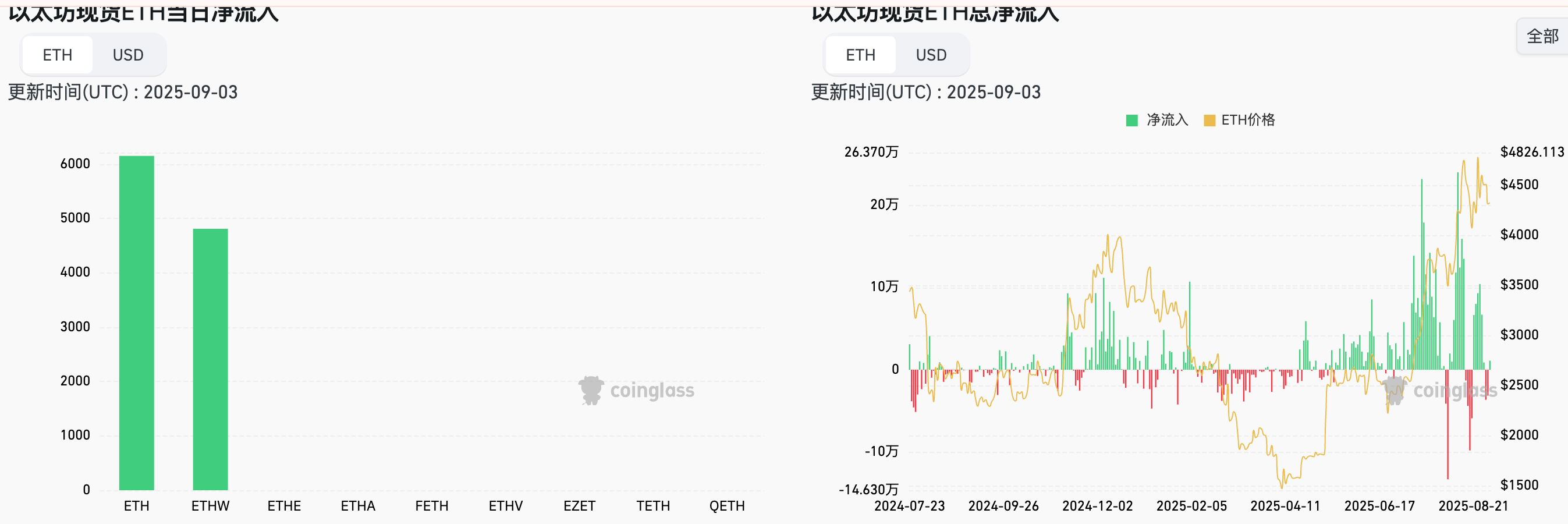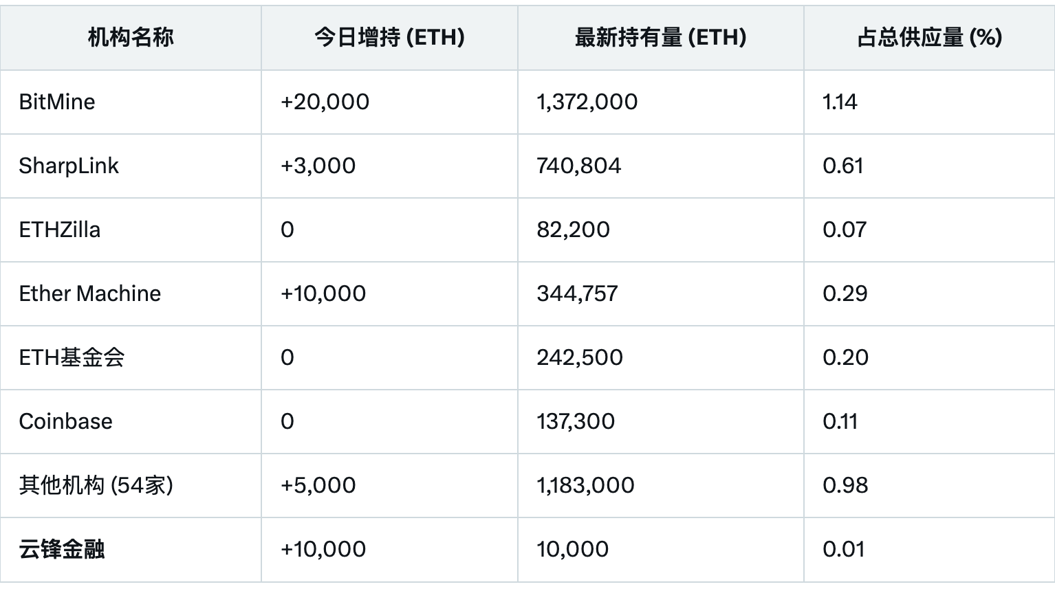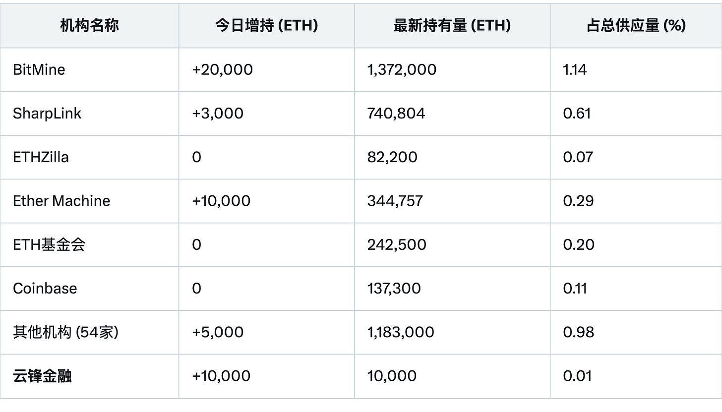 · 机构持有总量:约4,112,561 ETH(价值约183.9亿美元,占总供应量3.41%)